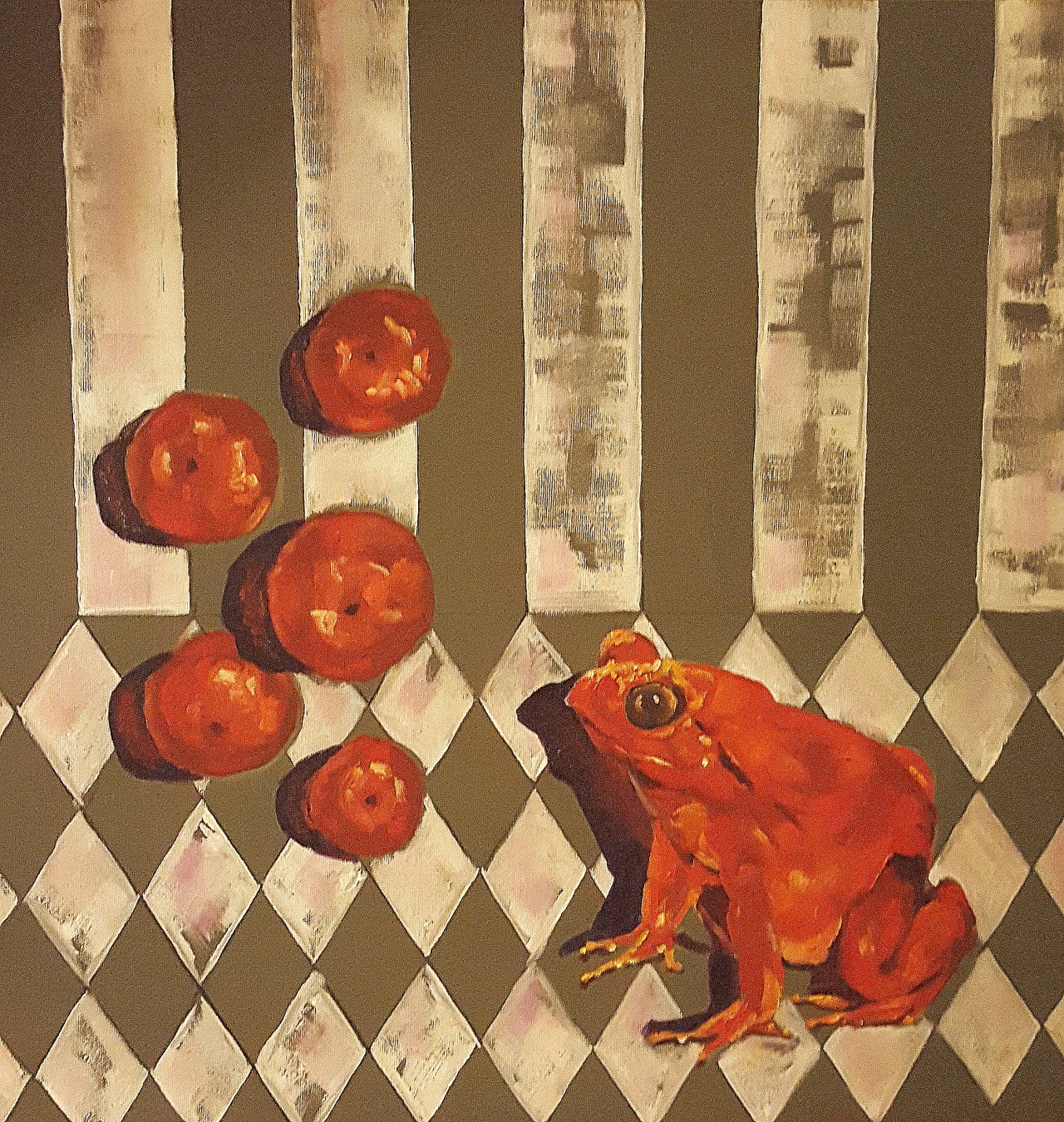 This painting is part of whimsy portrait created by Bhavna for her show Dreamland. She chose her favorite animals and placed them in somewhat unrealistic setting. Here a tomato frog looking on the red tomatoes’ parade passing by!