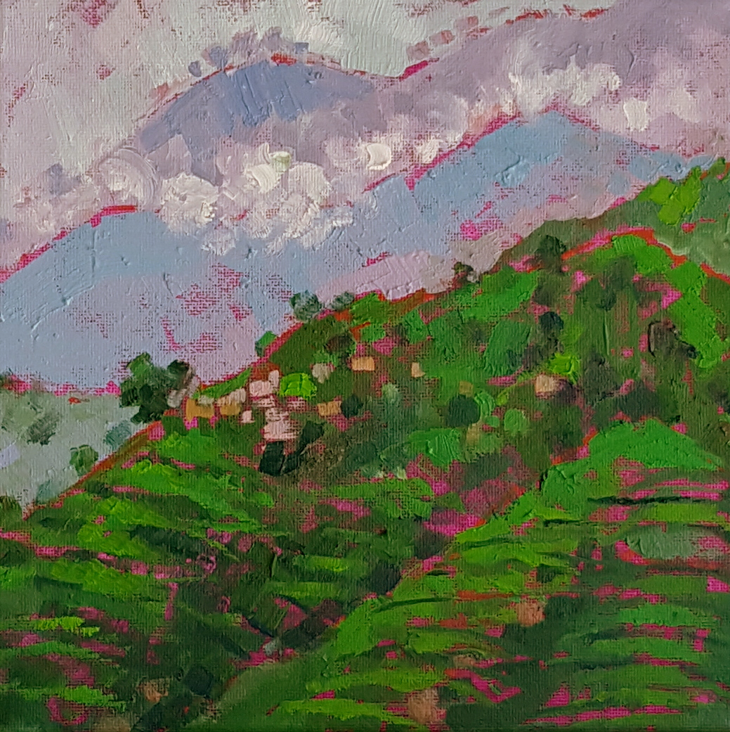 This painting is signature landscape artwork that Bhavna creates. She chooses sunlight as her guiding tool for the relative positioning of the planes and the local fauna.