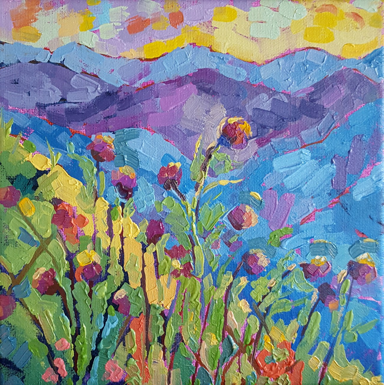 This painting is signature landscape artwork that Bhavna creates. She spotted this lovely hill view rich with local flora, during her recent road trip in the to hilly area. The hill was glowing in Sun and the light cast a multi colored shadow on the other side.