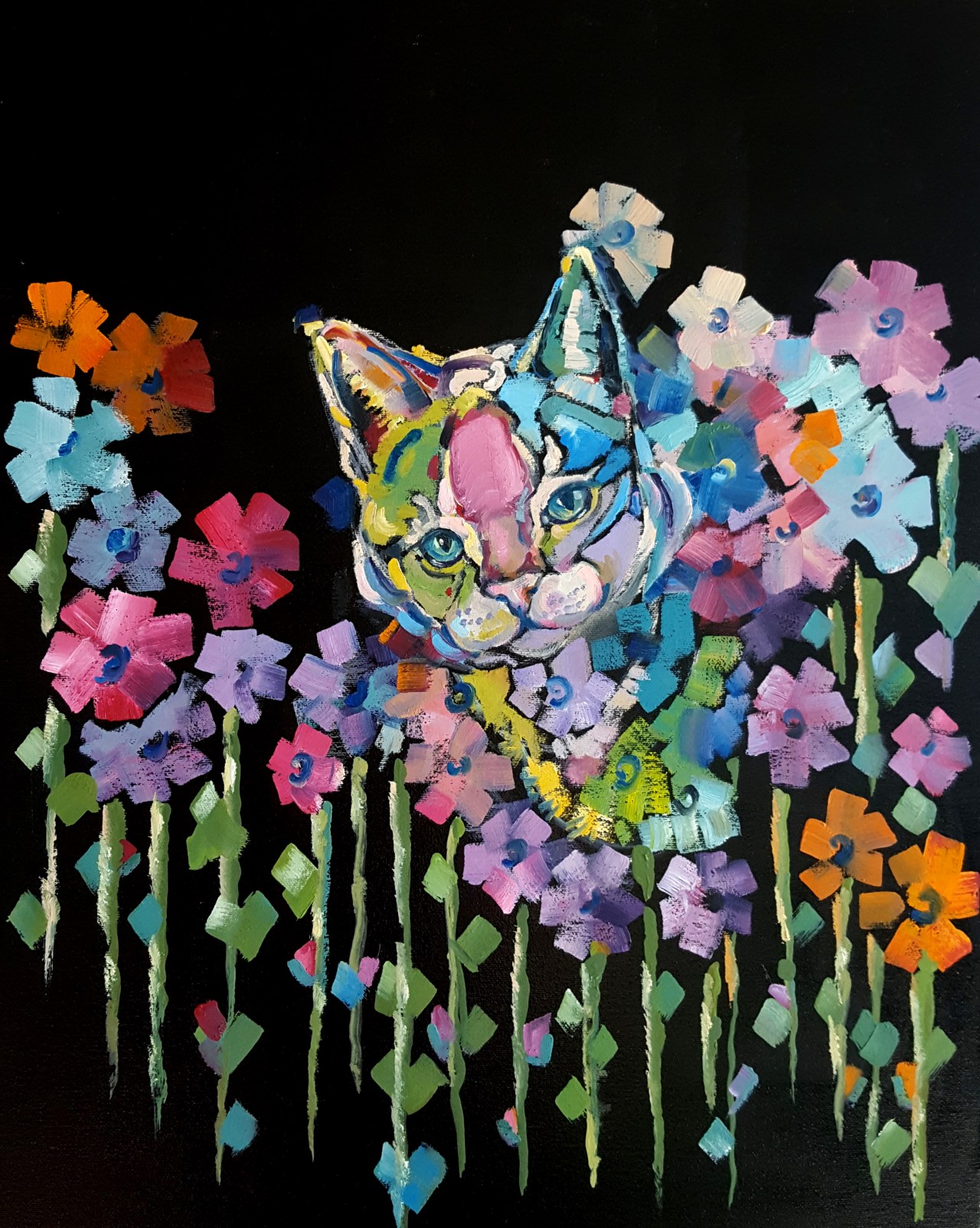 Some flowers, a beautiful cat, and some imagination. That resulted in this painting. Created on a high quality wrapped canvas using artist grade paints, a delightful treat to eyes. This painting is unframed and has a d-link and wire assembly on the back for frameless display.