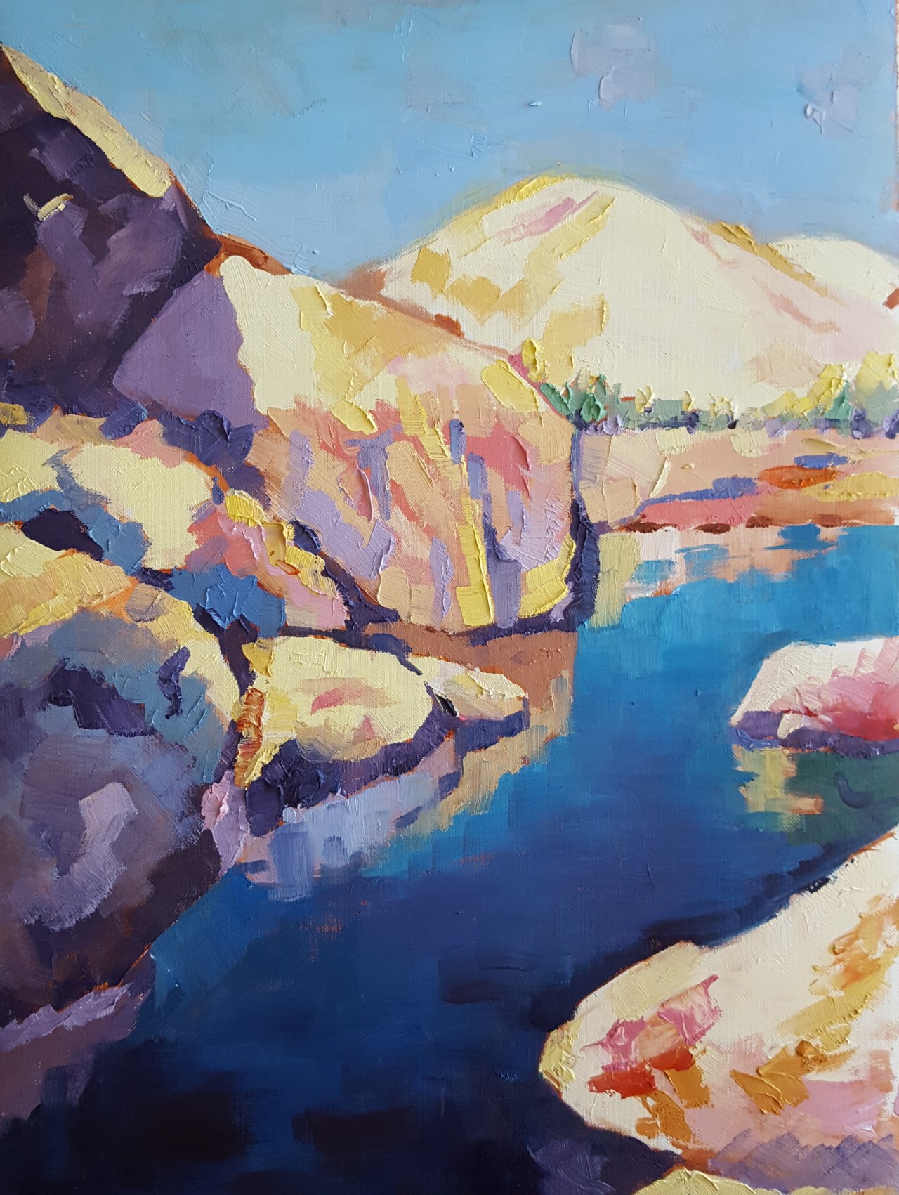 This painting is impressionistic landscape artwork similar to other ones in the series of National Parks. Bhavna chose to paint this landscape in the peak daylight scene. The colors are brighter and sharper as seen, not as actually are. The focus is on the peace and delight offered by the quiet landscape scene.
