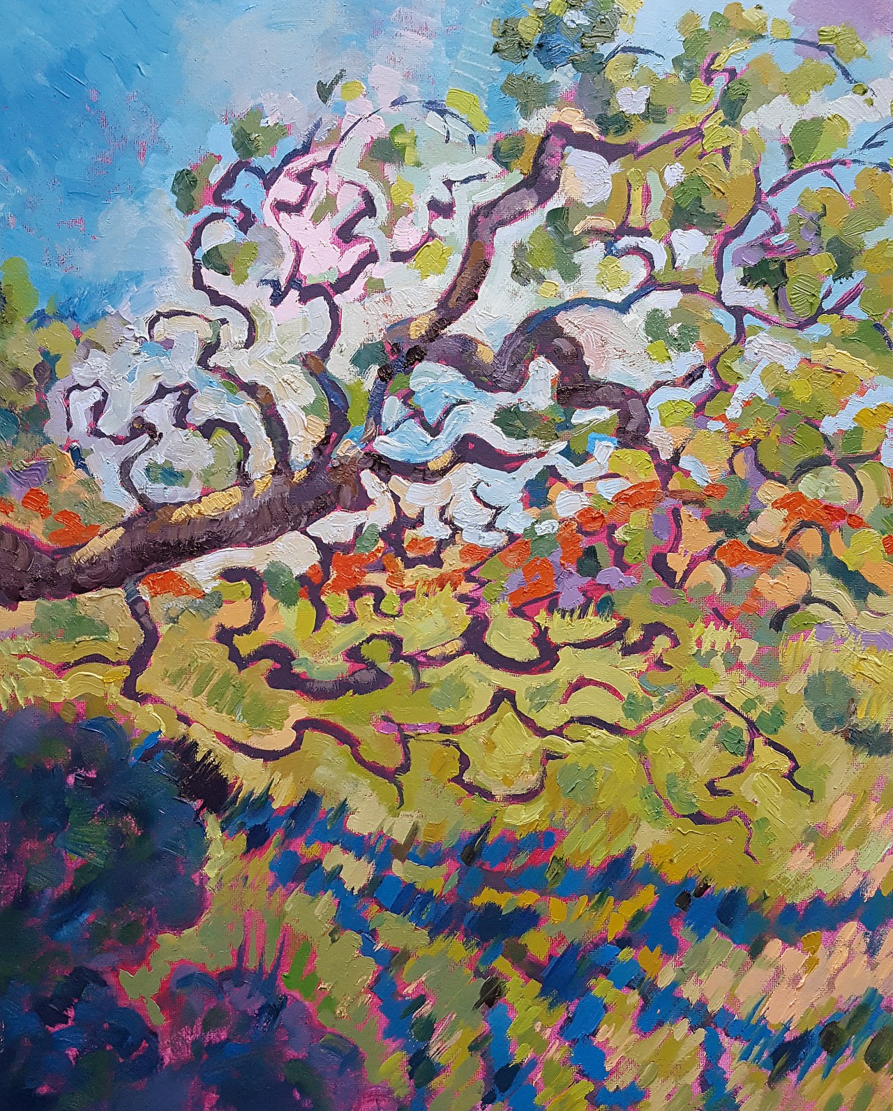 This artwork is inspired by the twisted branches of the old oak in Sunol Reserved area. The tree branches are tangling playfully as the cool breeze blows through, while the daylight casts a deep shadow on the hills’ grass underneath.