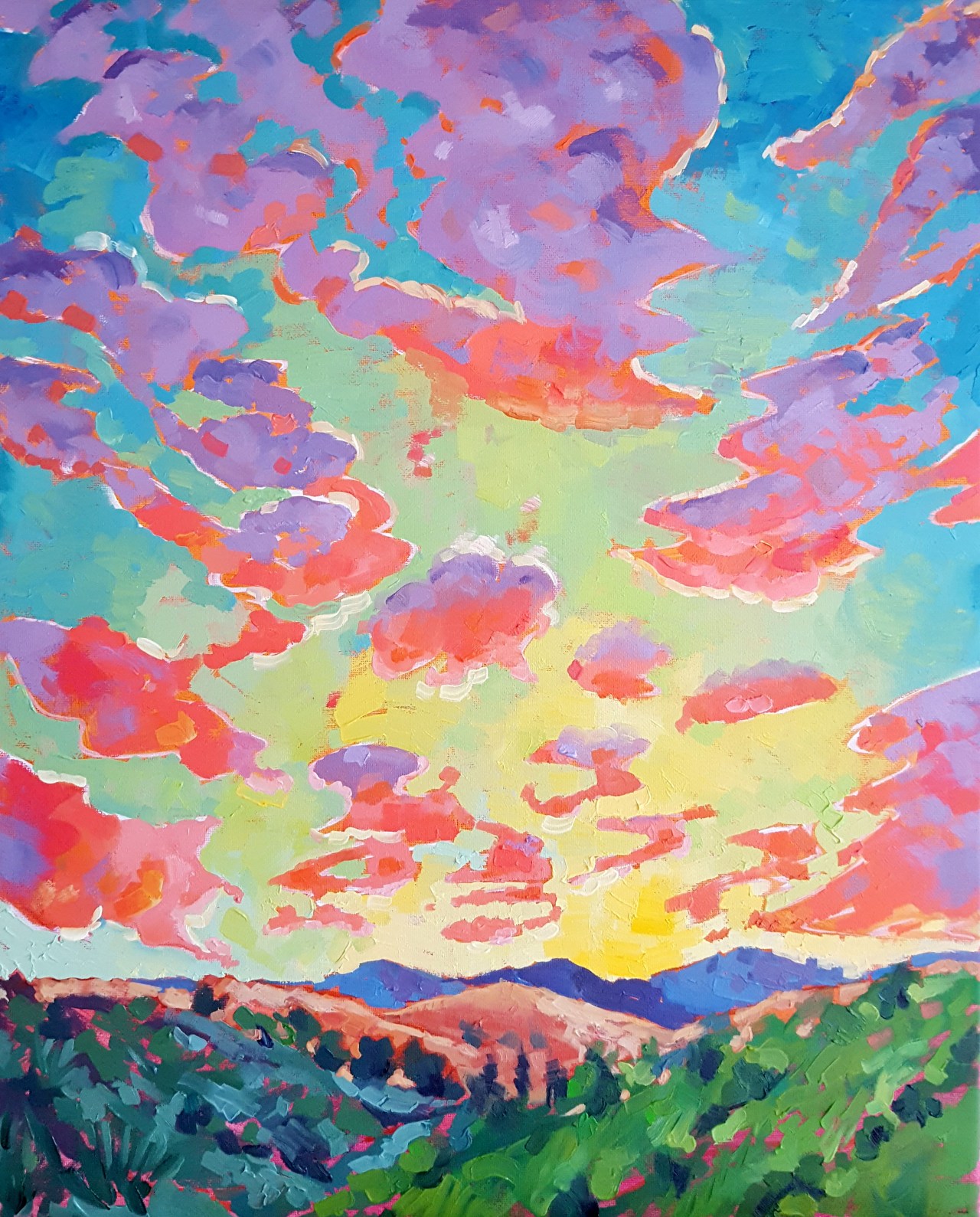 Painted with thick and bold brushstrokes during the evening hours before the nightfall causing the light to give a colorful mosaic of clouds. Enjoy the local hues at their peak vibrancy all across the canvas.