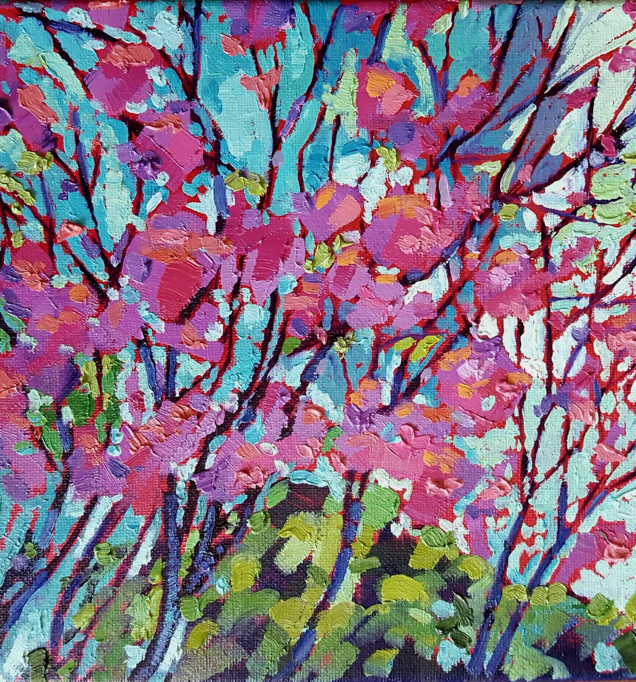 During spring, jacaranda trees are flushed with bright mauve and violet colored flowers. The floral heaven is a pleasure to paint.