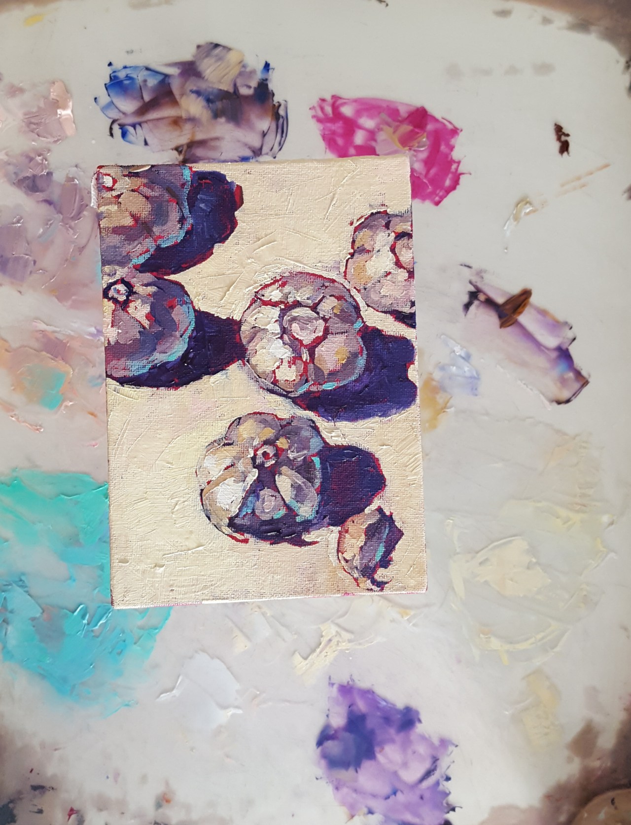 Little garlic heads are a pleasure to paint. This artwork is signature still-life artwork that Bhavna usually creates from real life (To view everyday sketches, please visit her Instagram account). You would love the rich brushstrokes and creamy texture of the surface.