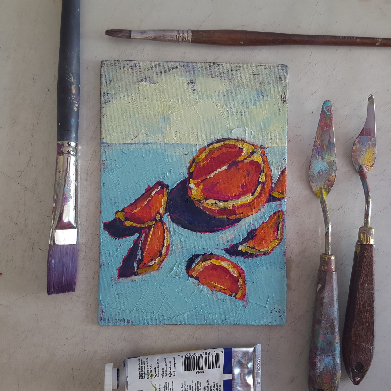 Painted today, it is a small delightful painting. This artwork is signature still-life artwork created for her ongoing Food series. You would love the rich brushstrokes and creamy texture of the surface.