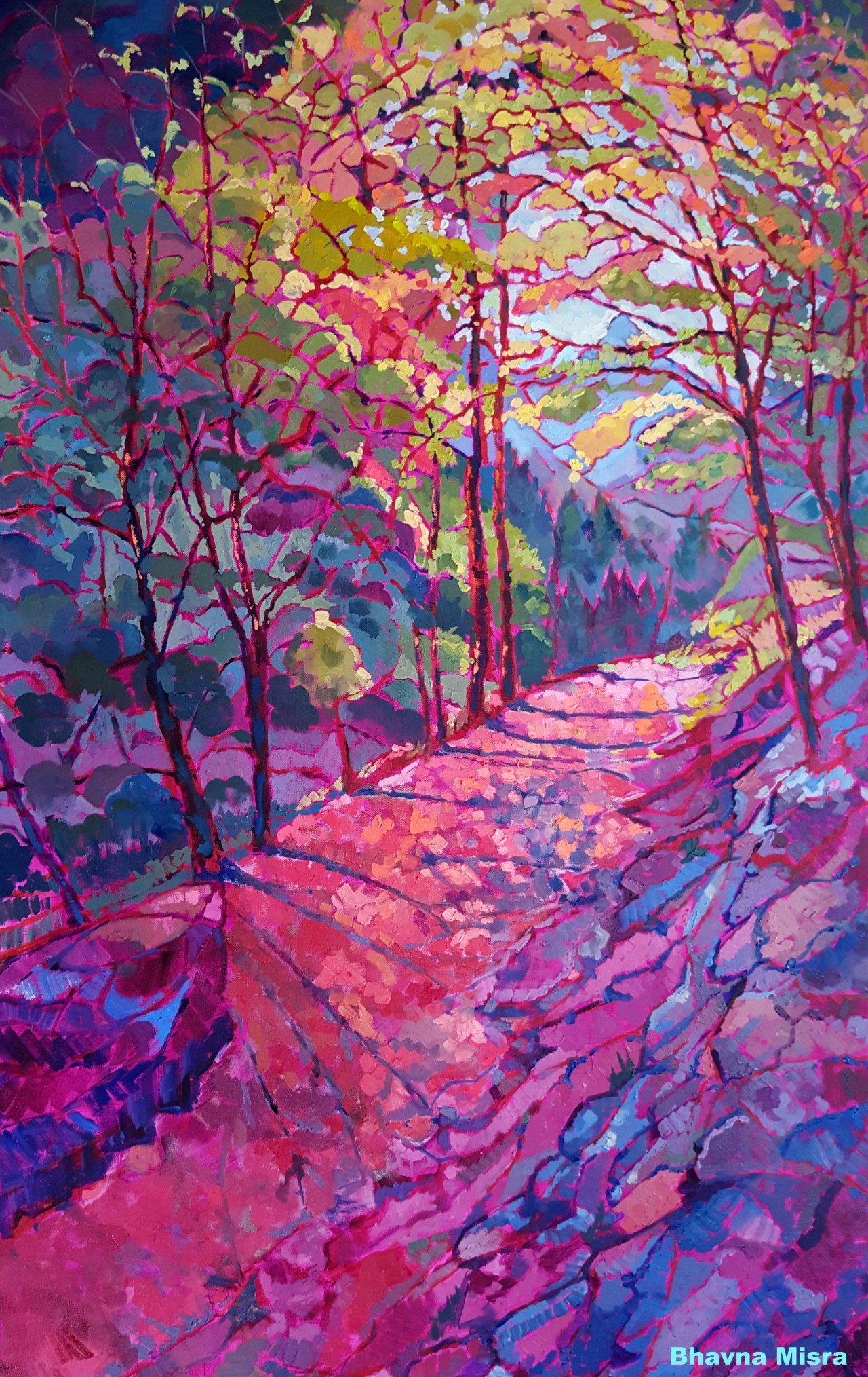 This painting is landscape artwork painted in impressionistic style similar to other ones in the series of landscapes. Bhavna chose to paint this morning scene in pink hues. The chosen palette is brighter and sharper as observed by the artist, not as are.