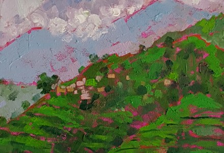 Little Hill Town Above the Step Fields I – Small Colorful Expressionistic Oil Painting (Sold)